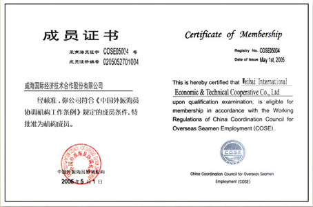 中國船員協(xié)會(huì)會(huì)員証明書