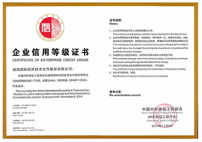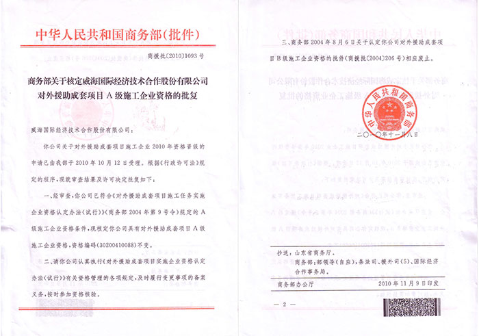 対外援助プロジェクトA級(jí)建設(shè)企業(yè)許可書…