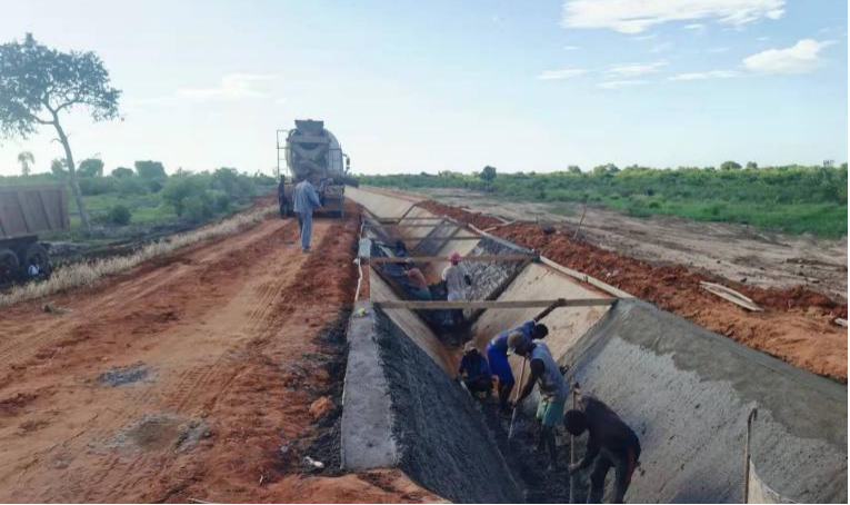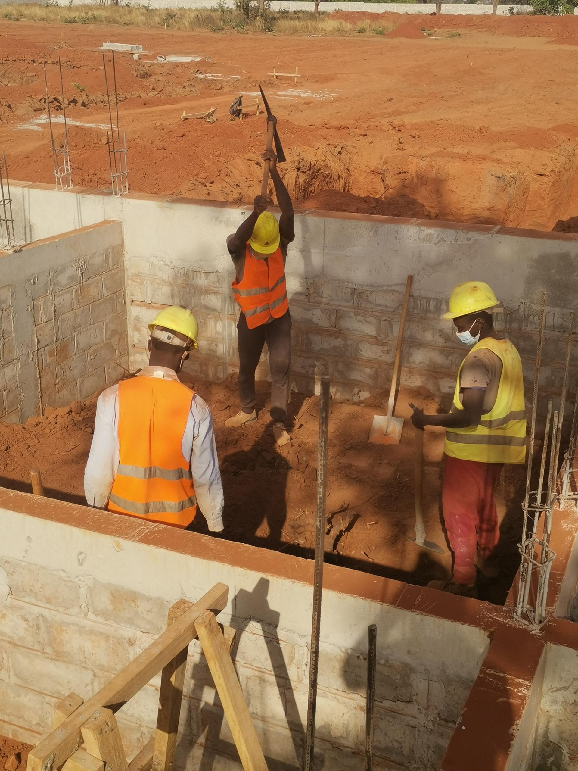 Remblayage en terre de la fondation en cours dans            Construction en béton de la poutre de la fondation en