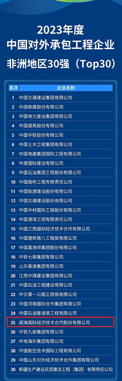 Le 7 mai, lors de la Conférence sur le développement de l’industrie d'entreprise des travaux à l’étranger 2024, la Chambre de commerce chinoise d'entreprise des travaux à l’étranger a publié plusieurs classements des entreprises chinoises des travaux à l'étranger en 2023. L'Entreprise a été sélectionnée avec succès dans Top 100 des entreprises chinoises des travaux à l'étranger, Top 30 des travaux de construction des batiments et Top 30 des affaires dans la région africaine, se classant respectivement 65ème, 25ème et 25ème, ce qui reflète une fois de plus la force croissante sans cesse de l'Entreprise en matière de développement à l'étranger.