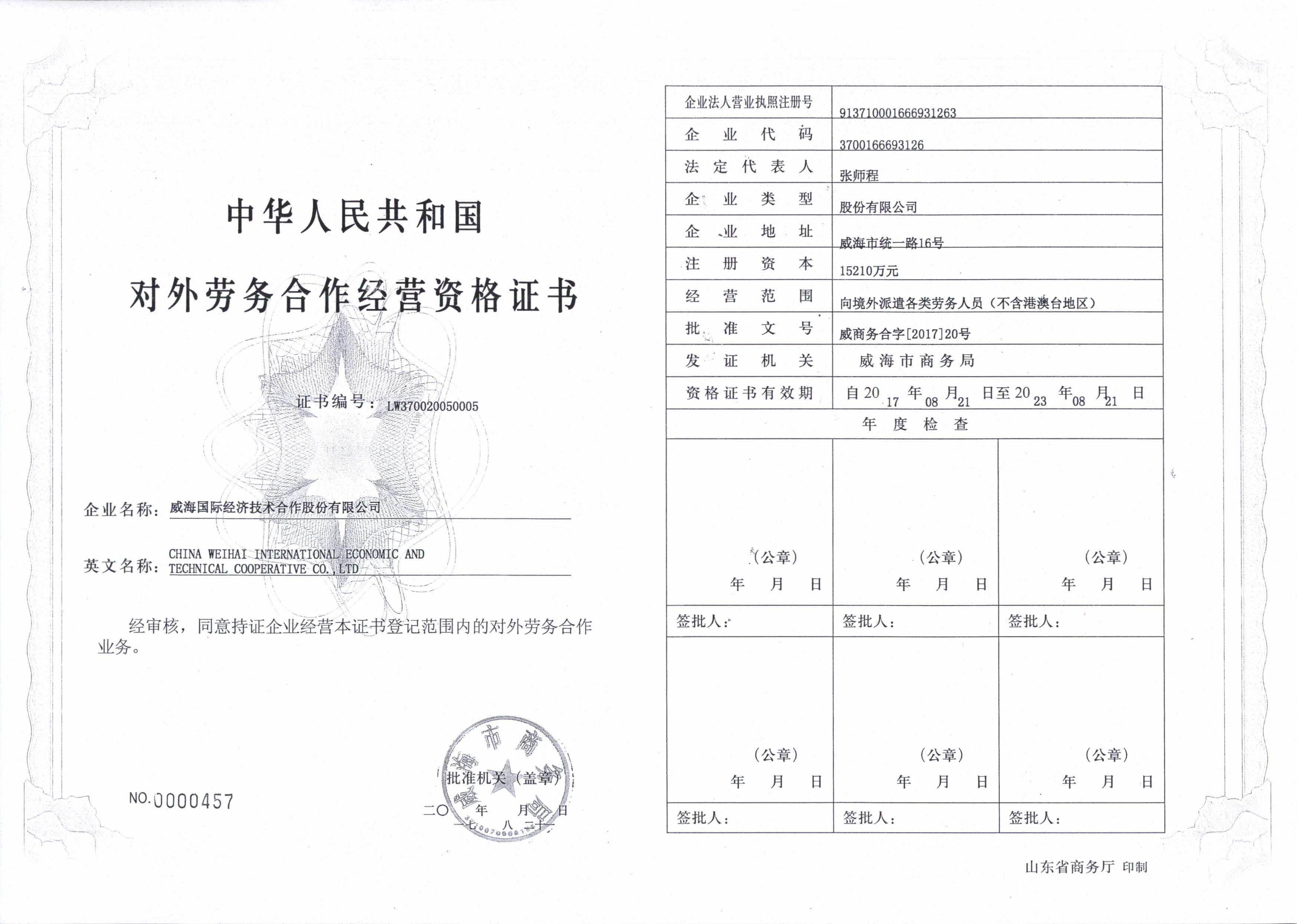 海外労働者(実習(xí)生含)派遣事業(yè)許可書