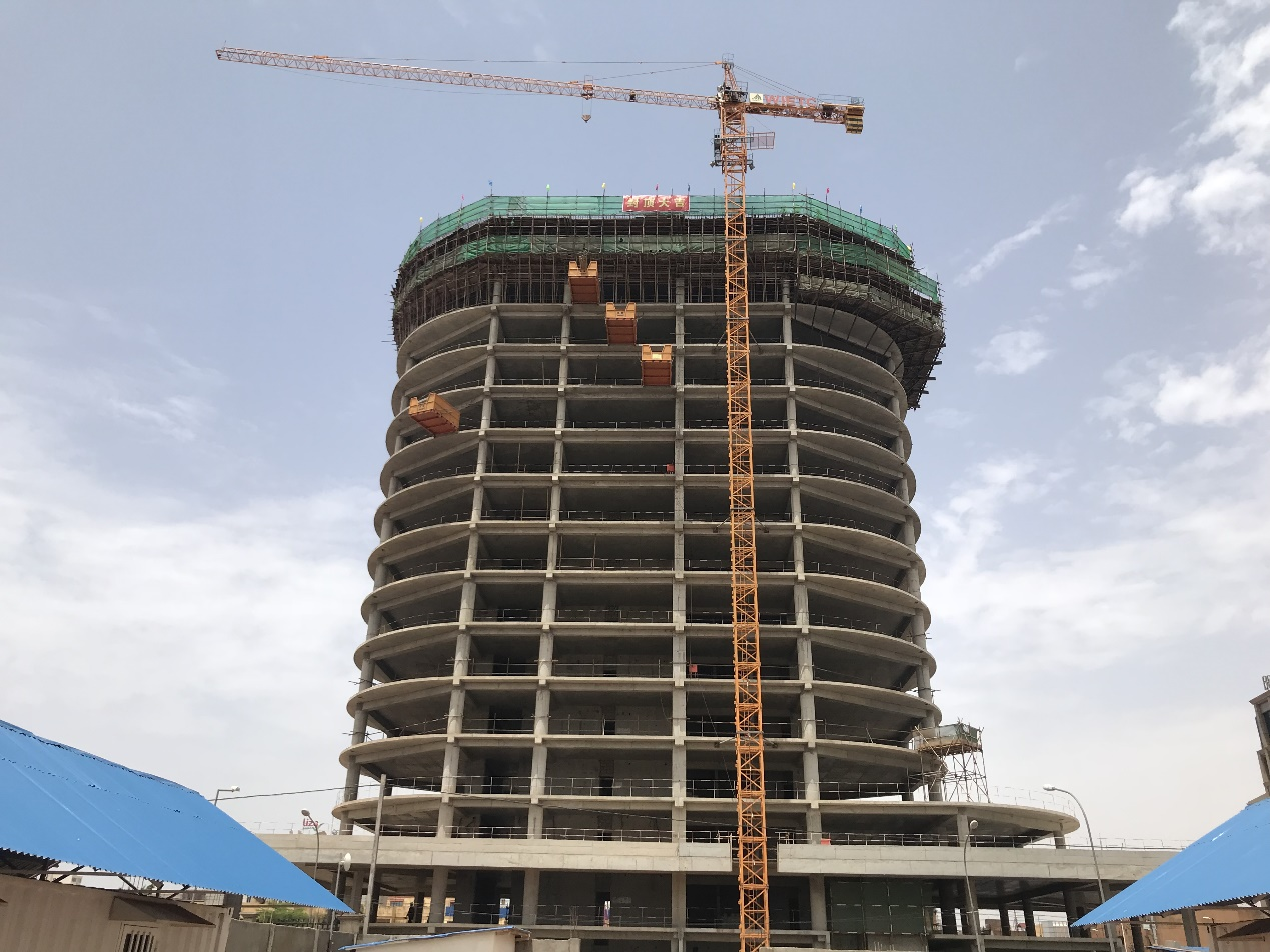 本件プロジェクトはブルキナファソの首都ワガドゥグー市に位置し、総建築面積約16000平方メートル、建築総高さ57メートル、地下1階地上15階で、現(xiàn)在ブルキナファソで最も高い建築となっており、現(xiàn)地のランドマーク的な建築の一つでもある。本件プロジェクトでは、単回コンクリート連続打設數(shù)、大型高所懸垂コンクリート構(gòu)造支持體系の施工などの面で、同國の建築業(yè)界で史上最高記録を多數(shù)更新した。著工以來、プロジェクトチームは新型コロナによる影響や、政局不安など數(shù)々の困難を克服し、工期厳守?品質(zhì)確保?安全確保?コスト削減に向け多くの措置を講じ、成功裏に本體落成を果たした。