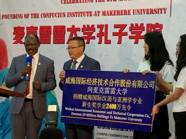 11月23日,為響應威海國際公司2019年“筑夢未來—教育公益行動”的倡議,烏干達正威公司向烏干達麥克雷雷大學孔子學院捐贈獎學金2400萬先令,約合人民幣46000元,用以獎勵15名漢語與亞洲學專業(yè)的新生。