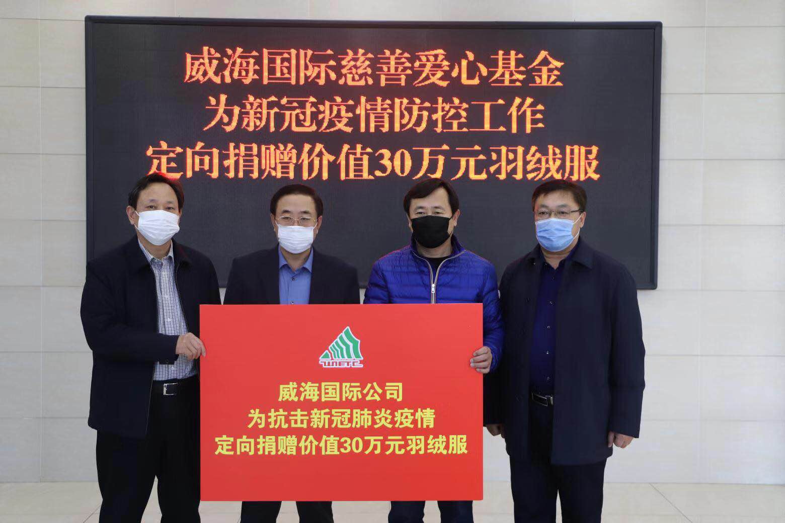 2月5日下午,威海國際公司慈善愛心基金為新冠肺炎疫情防控工作定向捐贈價值30萬元的羽絨服,助力威海市新冠肺炎疫情防控工作的開展。